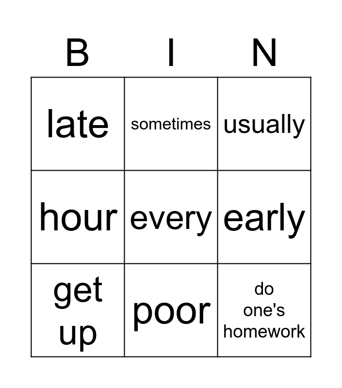 This bingo card has a free space and 8 words: early, usually, sometimes, get up, late, do one's homework, hour and poor.