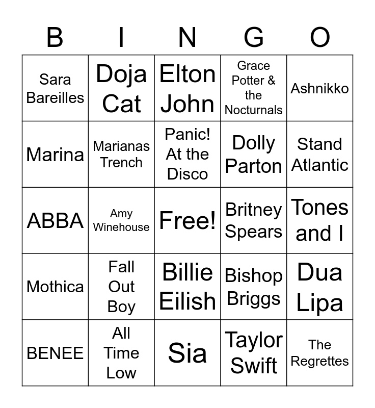 This bingo card has a free space and 24 words: Fall Out Boy, All Time Low, Panic! At the Disco, BENEE, Ashnikko, Sara Bareilles, Marina, Doja Cat, Britney Spears, Billie Eilish, Dolly Parton, ABBA, Bishop Briggs, Dua Lipa, Marianas Trench, Taylor Swift, Tones and I, Elton John, Stand Atlantic, Amy Winehouse, The Regrettes, Mothica, Grace Potter & the Nocturnals and Sia.