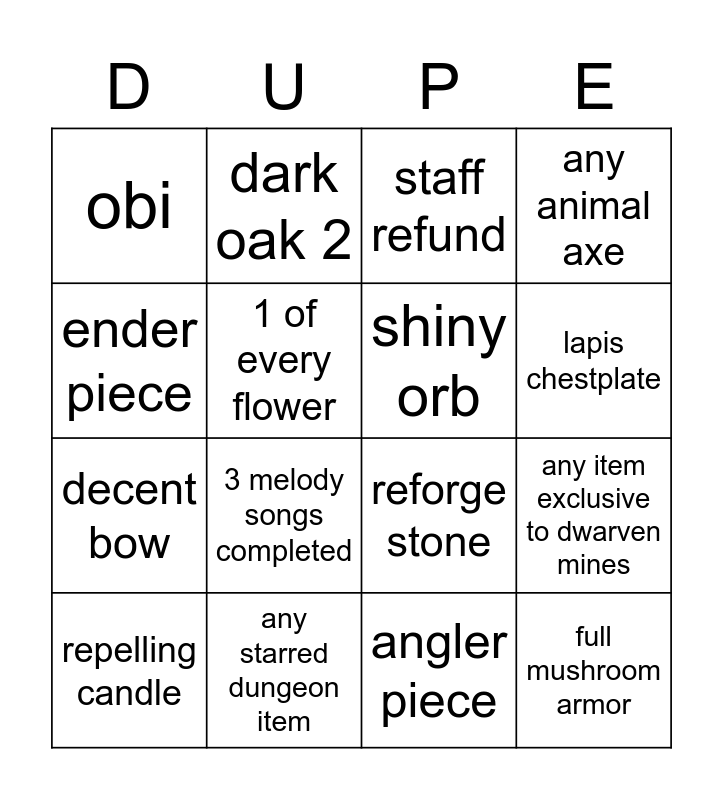This bingo card has 17 words: angler piece, repelling candle, staff refund, obi, 3 melody songs completed, any animal axe, any item exclusive to dwarven mines, shiny orb, lapis chestplate, 1 of every flower, any starred dungeon item, reforge stone, ender piece, dark oak 2, decent bow, dragon fragment and full mushroom armor.