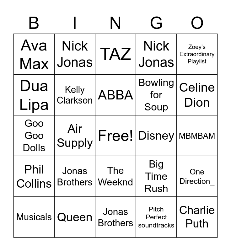 This bingo card has a free space and 24 words: Jonas Brothers, Queen, ABBA, Musicals, Zoey’s Extraordinary Playlist, Ava Max, Dua Lipa, Nick Jonas, Disney, The Weeknd, Bowling for Soup, Goo Goo Dolls, Big Time Rush, One Direction_, Kelly Clarkson, Pitch Perfect soundtracks, MBMBAM, TAZ, Celine Dion, Air Supply, Charlie Puth, Phil Collins, Nick Jonas and Jonas Brothers.