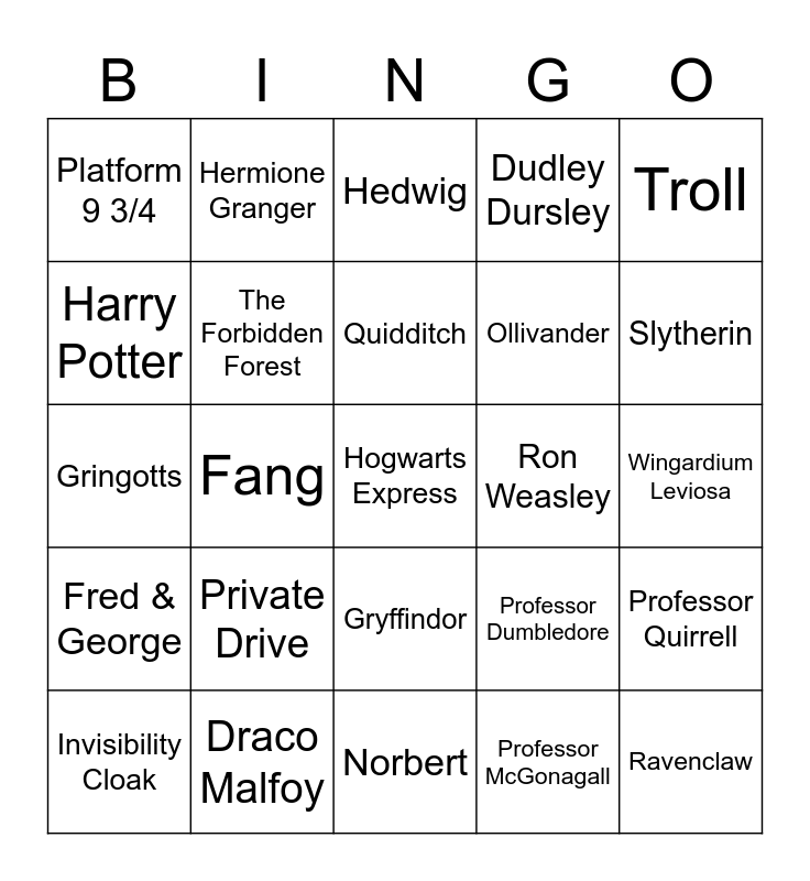 This bingo card has 25 words: Private Drive, Norbert, Quidditch, Invisibility Cloak, Troll, Platform 9 3/4, Harry Potter, Hermione Granger, Ron Weasley, Gryffindor, Ollivander, Gringotts, Professor Dumbledore, Professor Quirrell, The Forbidden Forest, Ravenclaw, Wingardium Leviosa, Hedwig, Slytherin, Fang, Hogwarts Express, Draco Malfoy, Fred & George, Dudley Dursley and Professor McGonagall.