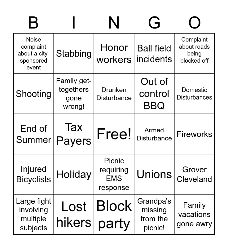 This bingo card has a free space and 25 words: Holiday, Block party, Drunken Disturbance, Large fight involving multiple subjects, Complaint about roads being blocked off, Noise complaint about a city-sponsored event, Shooting, Stabbing, Armed Disturbance, Picnic requiring EMS response, Out of control BBQ, End of Summer, Unions, Grover Cleveland, Family get-togethers gone wrong!, Noise complaints anytime before 7pm, Fireworks, Honor workers, Domestic Disturbances, Tax Payers, Family vacations gone awry, Lost hikers, Injured Bicyclists, Ball field incidents and Grandpa's missing from the picnic!.