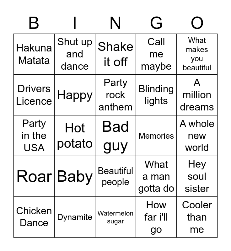 This bingo card has 30 words: Dynamite, Baby shark, Hot potato, Let it go, Hakuna Matata, Shake it off, Happy, Beautiful people, Memories, Watermelon sugar, A whole new world, Bad guy, How far i'll go, Cooler than me, A million dreams, Slow hands, What a man gotta do, Roar, Baby, What makes you beautiful, Party in the USA, Thunder, Shut up and dance, Blinding lights, Drivers Licence, Call me maybe, Hey soul sister, Chicken Dance, Party rock anthem and Magic.