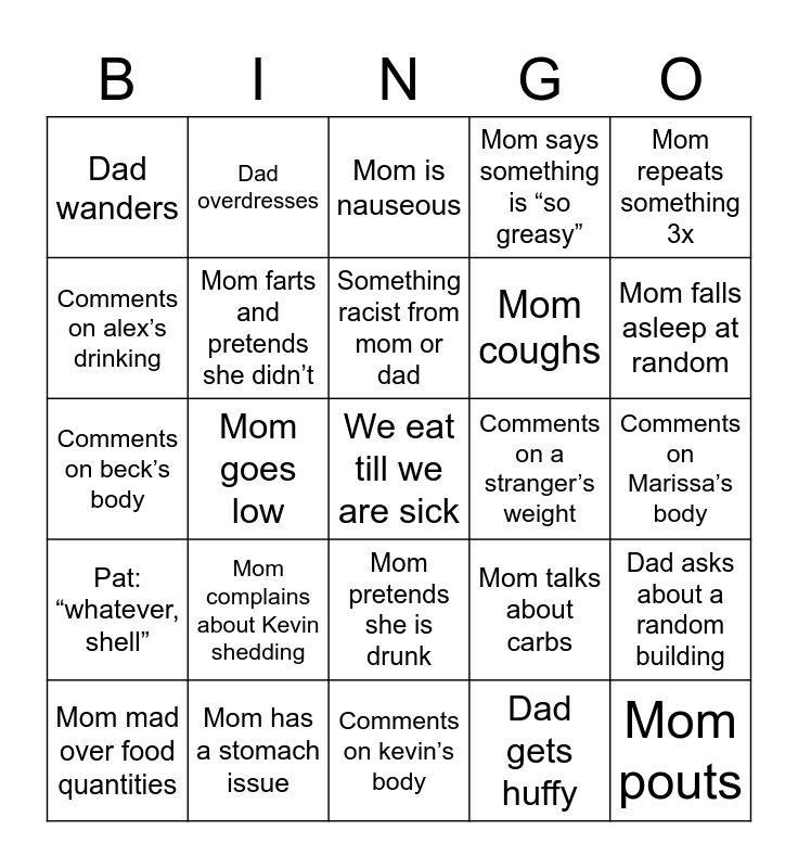 This bingo card has a free space and 24 words: Mom complains about Kevin shedding, Mom has a stomach issue, Something racist from mom or dad, Mom mad over food quantities, Mom repeats something 3x, Dad wanders, Comments on alex’s drinking, Dad overdresses, Comments on a stranger’s weight, Mom pretends she is drunk, Mom coughs, Comments on beck’s body, Mom talks about carbs, Dad asks about a random building, Mom farts and pretends she didn’t, Dad gets huffy, Comments on Marissa’s body, Mom is nauseous, Mom falls asleep at random, Mom goes low, Mom pouts, Pat: “whatever, shell”, Mom says something is “so greasy” and Comments on kevin’s body.