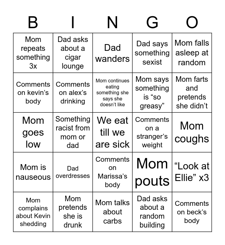 This bingo card has a free space and 29 words: Mom complains about Kevin shedding, Mom has a stomach issue, Something racist from mom or dad, Mom mad over food quantities, Mom repeats something 3x, Dad wanders, Comments on alex’s drinking, Dad overdresses, Comments on a stranger’s weight, Mom pretends she is drunk, Mom coughs, Comments on beck’s body, Mom talks about carbs, Dad asks about a random building, Mom farts and pretends she didn’t, Dad gets huffy, Comments on Marissa’s body, Mom is nauseous, Mom falls asleep at random, Mom goes low, Mom pouts, Pat: “whatever, shell”, Mom says something is “so greasy”, Comments on kevin’s body, Dad says something sexist, Dad asks about a cigar lounge, “Look at Ellie” x3, Mom continues eating something she says she doesn’t like and Dad talks about “branch water”.