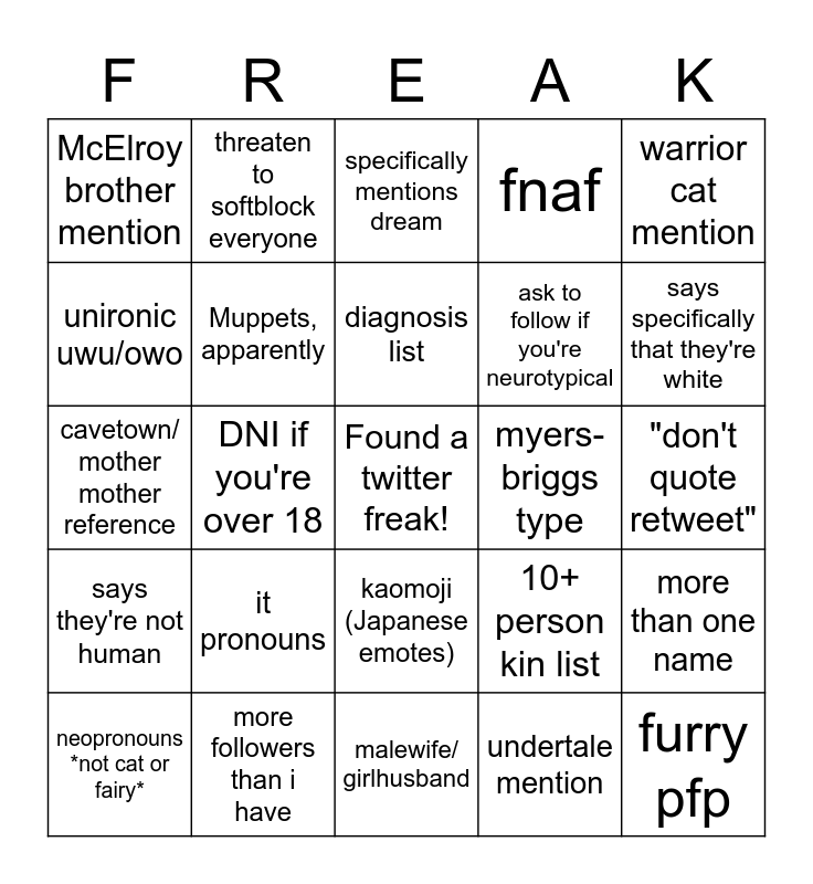 This bingo card has a free space and 24 words: it pronouns, more followers than i have, diagnosis list, neopronouns *not cat or fairy*, warrior cat mention, McElroy brother mention, unironic uwu/owo, threaten to softblock everyone, myers-briggs type, kaomoji (Japanese emotes), ask to follow if you're neurotypical, cavetown/ mother mother reference, 10+ person kin list, more than one name, Muppets, apparently, undertale mention, "don't quote retweet", specifically mentions dream, says specifically that they're white, DNI if you're over 18, furry pfp, says they're not human, fnaf and malewife/ girlhusband.