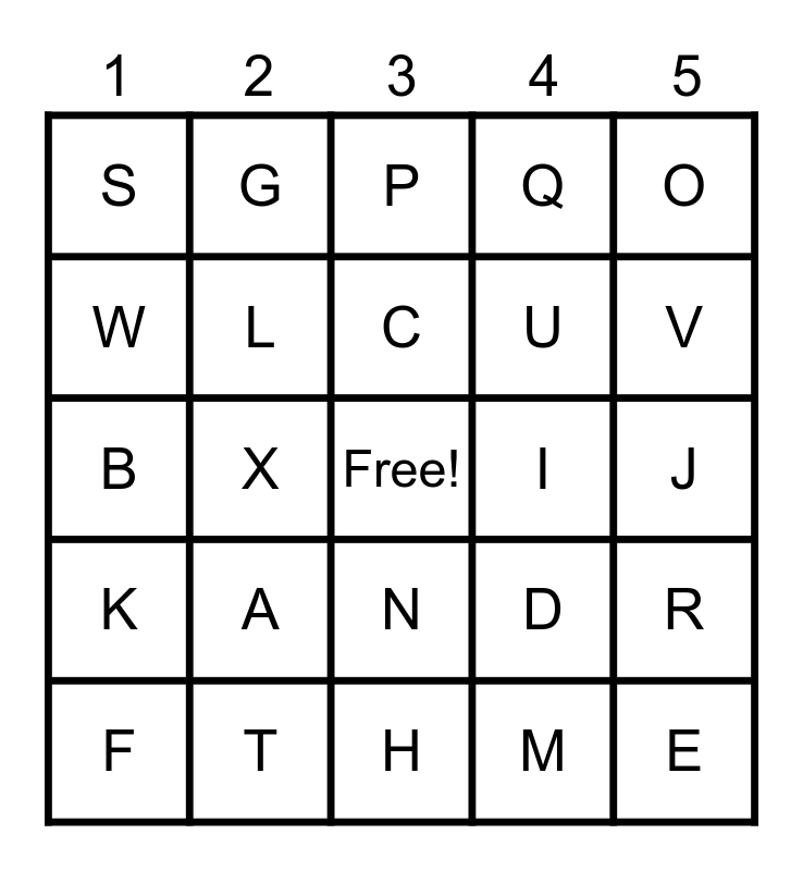 This bingo card has a free space and 24 words: F, A, C, M, O, S, G, P, I, J, B, L, D, R, W, T, H, Q, V, K, X, N, U and E.