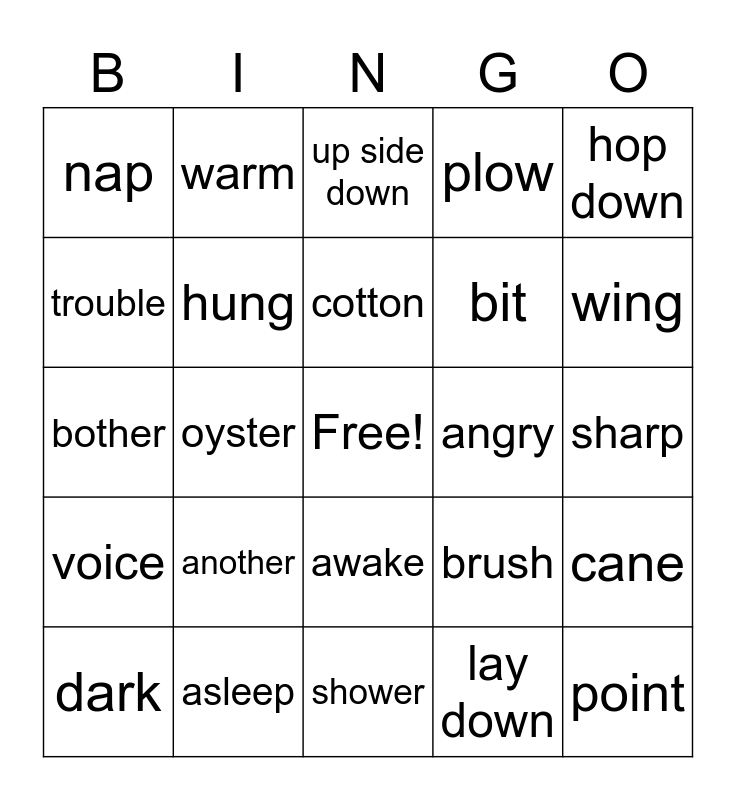 This bingo card has a free space and 24 words: another, asleep, cotton, dark, hop down, nap, trouble, warm, angry, awake, bit, bother, brush, cane, hung, lay down, sharp, up side down, wing, oyster, point, voice, plow and shower.