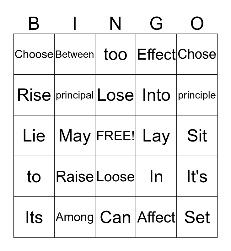 This bingo card has a free space and 24 words: Raise, Among, Lose, Its, Chose, Choose, Rise, Between, Lay, Loose, Into, Lie, In, It's, principal, Affect, Sit, too, principle, May, Set, to, Effect and Can.