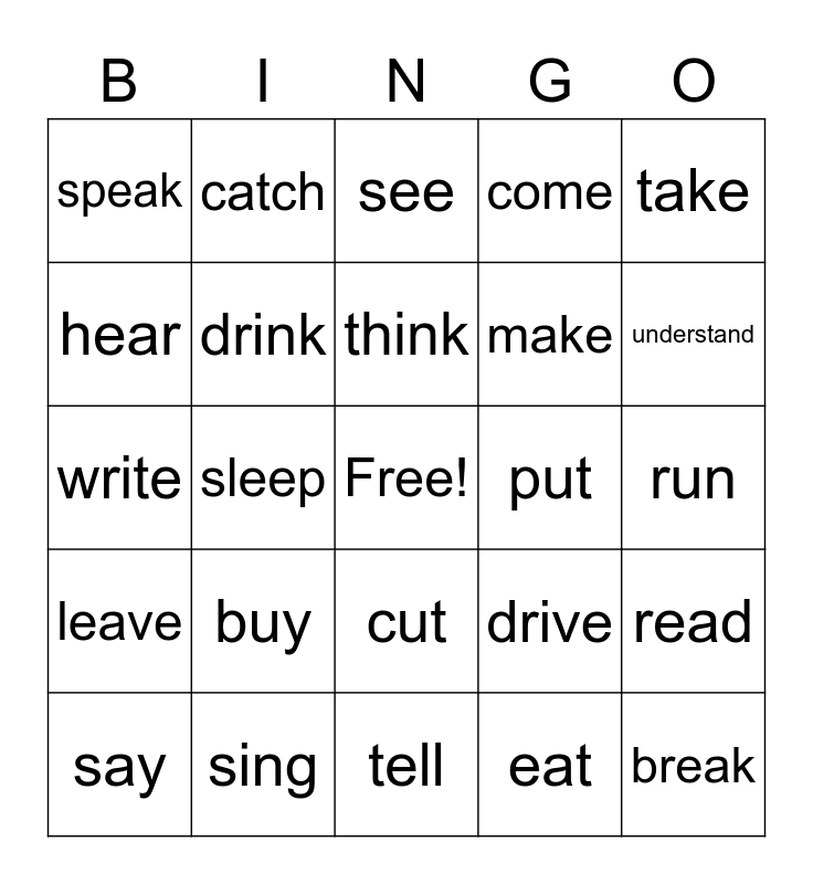 This bingo card has a free space and 24 words: buy, sing, think, say, take, speak, hear, catch, put, cut, make, write, drive, read, drink, eat, run, see, understand, sleep, break, leave, come and tell.