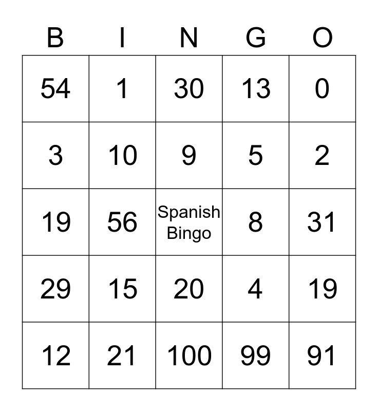 This bingo card has a free space and 24 words: 15, 21, 9, 12, 0, 54, 3, 1, 8, 20, 5, 19, 4, 19, 10, 99, 31, 30, 2, 56, 91, 29, 13 and 100.