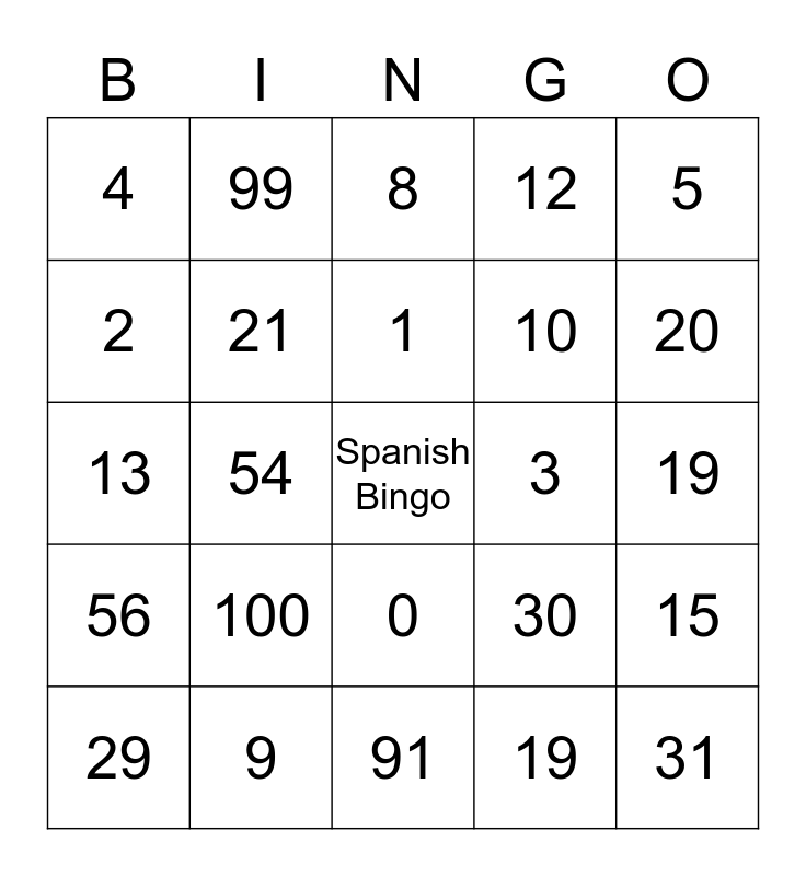This bingo card has a free space and 24 words: 100, 9, 1, 29, 5, 4, 2, 99, 3, 0, 10, 13, 30, 15, 21, 19, 19, 8, 20, 54, 31, 56, 12 and 91.