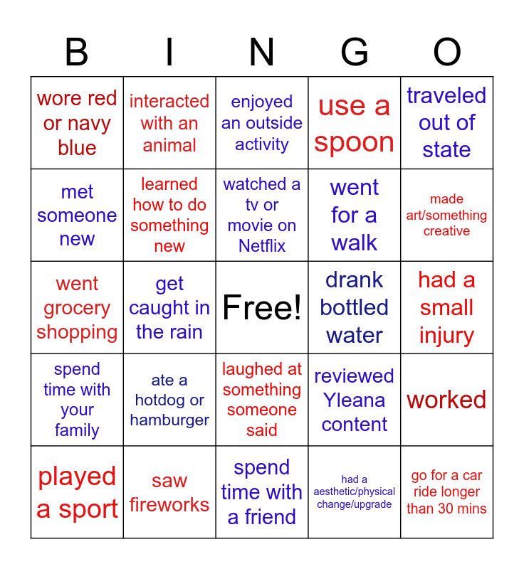 This bingo card has a free space and 24 words: ate a hotdog or hamburger, saw fireworks, watched a tv or movie on Netflix, played a sport, traveled out of state, wore red or navy blue, met someone new, interacted with an animal, drank bottled water, laughed at something someone said, went for a walk, went grocery shopping, reviewed Yleana content, worked, learned how to do something new, had a aesthetic/physical change/upgrade, had a small injury, enjoyed an outside activity, made art/something creative, get caught in the rain, go for a car ride longer than 30 mins, spend time with your family, use a spoon and spend time with a friend.