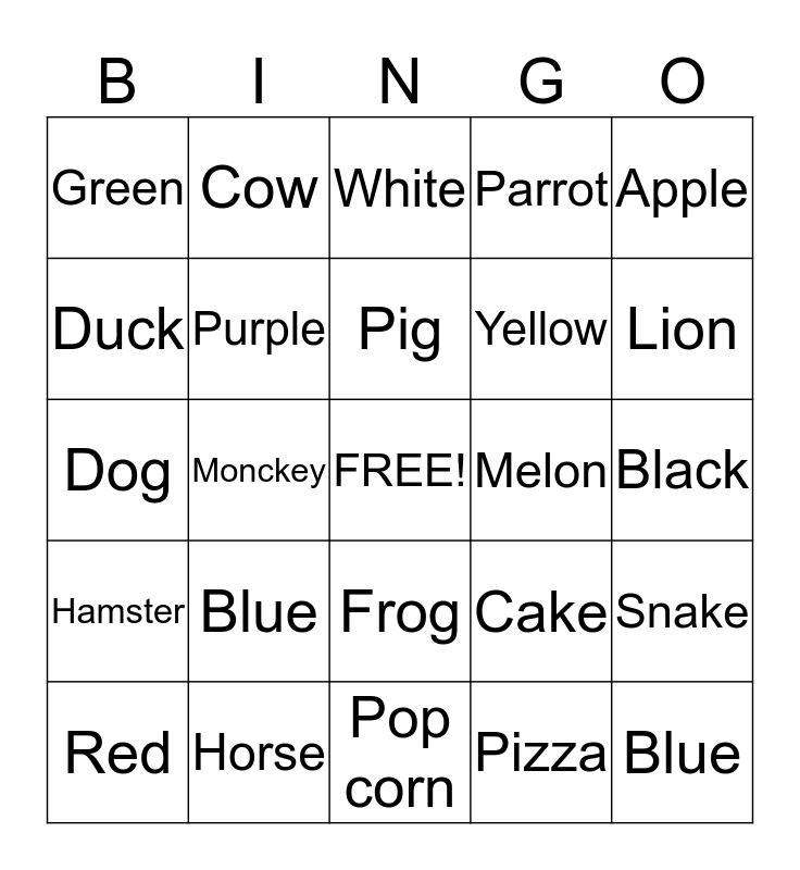 This bingo card has a free space and 24 words: Blue, Horse, Pig, Red, Apple, Green, Duck, Cow, Melon, Frog, Yellow, Dog, Cake, Snake, Purple, Pizza, Black, White, Lion, Monckey, Blue, Hamster, Parrot and Pop corn.