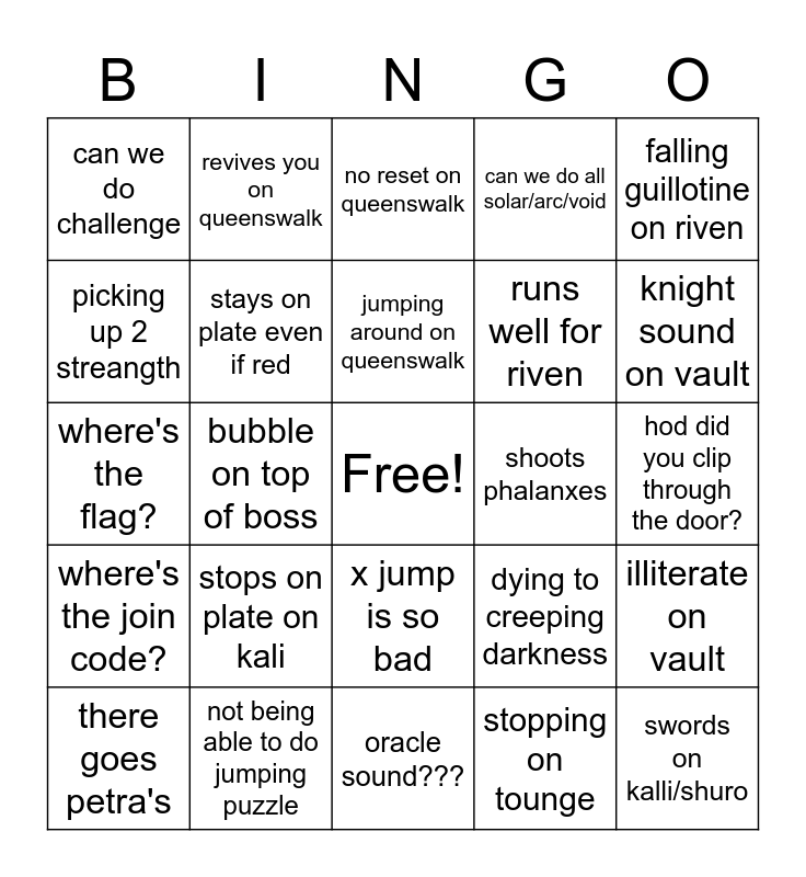 This bingo card has a free space and 24 words: stops on plate on kali, not being able to do jumping puzzle, jumping around on queenswalk, there goes petra's, falling guillotine on riven, can we do challenge, picking up 2 streangth, revives you on queenswalk, shoots phalanxes, x jump is so bad, runs well for riven, where's the flag?, dying to creeping darkness, illiterate on vault, stays on plate even if red, stopping on tounge, hod did you clip through the door?, no reset on queenswalk, knight sound on vault, bubble on top of boss, swords on kalli/shuro, where's the join code?, can we do all solar/arc/void and oracle sound???.