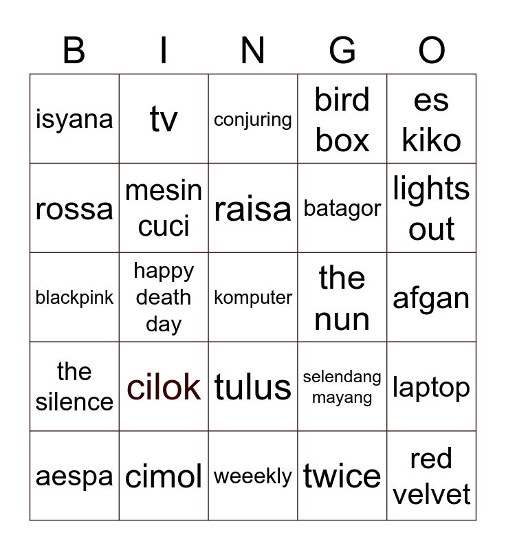 This bingo card has a free space and 24 words: cilok, cimol, raisa, aespa, es kiko, isyana, rossa, tv, the nun, tulus, batagor, blackpink, selendang mayang, laptop, mesin cuci, twice, afgan, conjuring, lights out, happy death day, red velvet, the silence, bird box and weeekly.