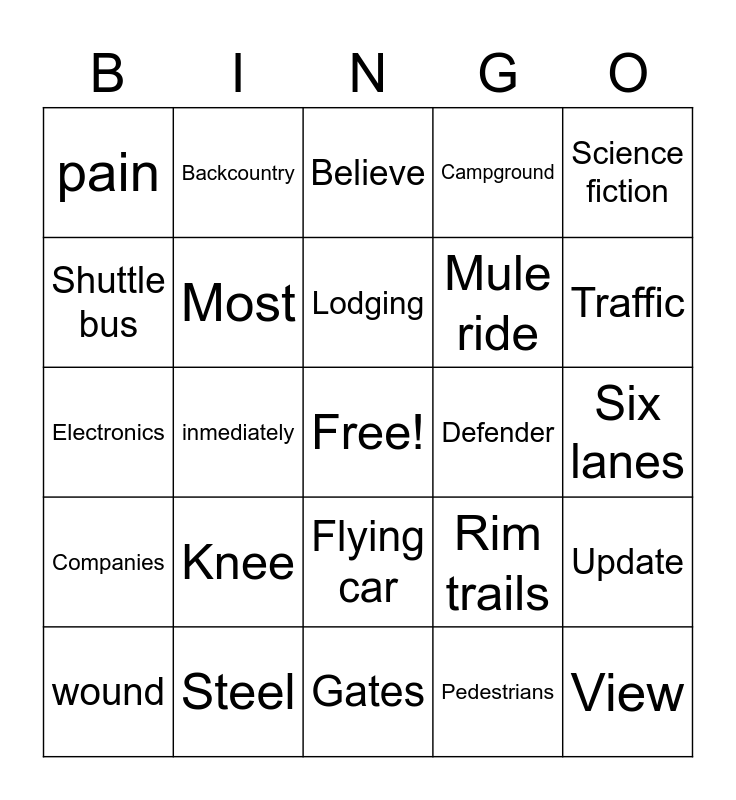 This bingo card has a free space and 29 words: wound, biggest, inmediately, several, pain, Believe, Most, Knee, Defender, Steel, Six lanes, View, Gates, Pedestrians, Traffic, Suspension, Flying car, Companies, Science fiction, Electronics, Rim trails, Desert view, Mule ride, Shuttle bus, Campground, Backcountry, Update, Lodging and Village.
