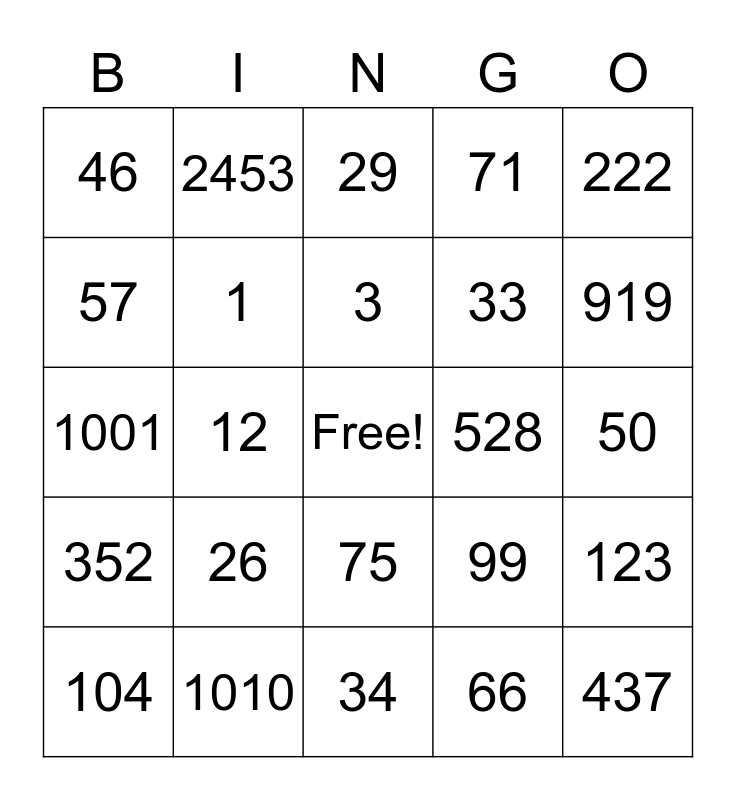This bingo card has a free space and 24 words: 26, 1010, 3, 104, 222, 46, 57, 2453, 528, 75, 33, 1001, 99, 123, 1, 66, 50, 29, 919, 12, 437, 352, 71 and 34.