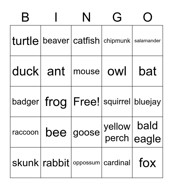 This bingo card has a free space and 28 words: bald eagle, wild turkey, owl, cardinal, duck, catfish, beaver, raccoon, squirrel, skunk, badger, chipmunk, rabbit, oppossum, bat, butterfly, bee, ant, mouse, goose, turtle, snake, fox, frog, bluejay, yellow perch, salamander and crane.