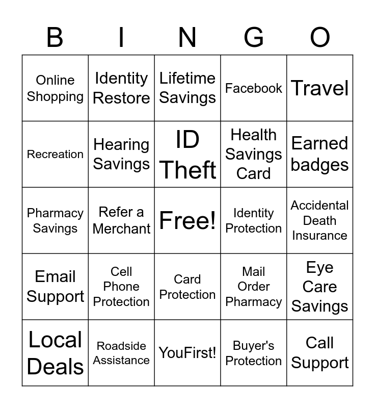This bingo card has a free space and 24 words: Cell Phone Protection, Roadside Assistance, ID Theft, Local Deals, Travel, Online Shopping, Recreation, Identity Restore, Identity Protection, Card Protection, Health Savings Card, Pharmacy Savings, Mail Order Pharmacy, Eye Care Savings, Hearing Savings, Buyer's Protection, Accidental Death Insurance, Lifetime Savings, Earned badges, Refer a Merchant, Call Support, Email Support, Facebook and YouFirst!.