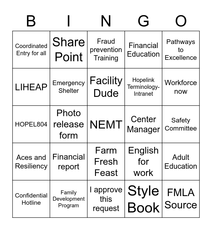 This bingo card has 51 words: Free!, NEMT, byte ticket, I approve this request, Financial report, S Drive, Share Point, Mobile Market, LIHEAP, Transitional Housing, Emergency Shelter, Financial Education, Adult Education, English for work, Budget Software, Capital Request, Facility Dude, Center Manager, SKCMC, Pathways to Excellence, Photo release form, Style Book, Coordinated Entry for all, Hopelink Terminology-Intranet, Incident Report, FMLA Source, Workforce now, MPP, Confidential Hotline, Fraud prevention Training, Capital Request, A standard order costs $55.75, Circle Of Hope, Safe Ride Health, Community Van, Family Development Program, End Family Hunger, Change Order, EAP Program, FortiClient 6.0, Safety Committee, Aces and Resiliency, EDI Training, Trauma Informed Leadership, Mental Health First Aid, DART RFP, HOPEL804, Lost asset form, ADP Questions, Farm Fresh Feast and Hopelink Harvest.