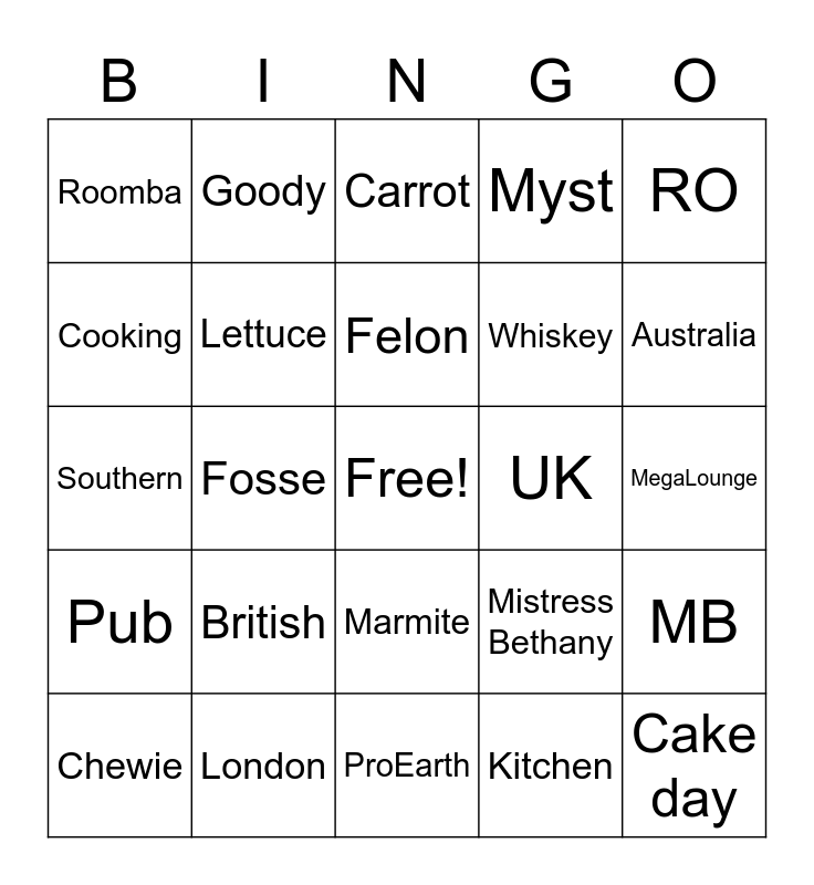 This bingo card has a free space and 29 words: Chewie, Cordelia, Fosse, Ditchdigger, Roomba, Carrot, Lettuce, British, UK, London, MegaLounge, Cake day, ProEarth, Kitchen, Australia, Vegemite, Marmite, Pub, RO, Southern, Mistress Bethany, Goldy, Whiskey, Cooking, Myst, Goody, MB, Felon and Science.