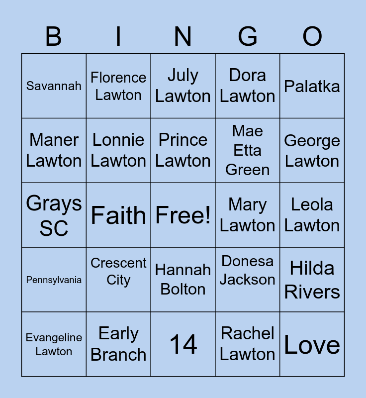 This bingo card has a free space and 24 words: Crescent City, Early Branch, Prince Lawton, Evangeline Lawton, Palatka, Savannah, Maner Lawton, Florence Lawton, Mary Lawton, Hannah Bolton, Mae Etta Green, Grays SC, Donesa Jackson, Hilda Rivers, Lonnie Lawton, Rachel Lawton, Leola Lawton, July Lawton, George Lawton, Faith, Love, Pennsylvania, Dora Lawton and 14.