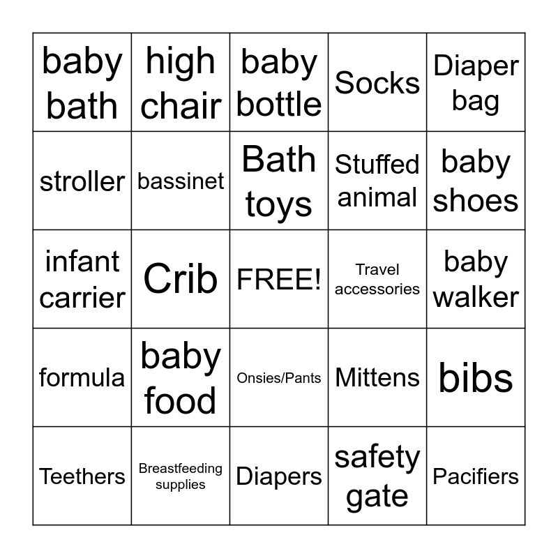 This bingo card has a free space and 24 words: baby food, Breastfeeding supplies, Bath toys, Teethers, Diaper bag, baby bath, stroller, high chair, Travel accessories, Onsies/Pants, Stuffed animal, infant carrier, Mittens, bibs, bassinet, safety gate, baby walker, baby bottle, baby shoes, Crib, Pacifiers, formula, Socks and Diapers.