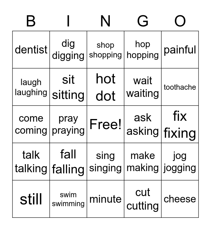 This bingo card has a free space and 24 words: fall falling, swim swimming, hot dot, still, painful, dentist, laugh laughing, dig digging, ask asking, sing singing, wait waiting, come coming, make making, jog jogging, sit sitting, cut cutting, fix fixing, shop shopping, toothache, pray praying, cheese, talk talking, hop hopping and minute.