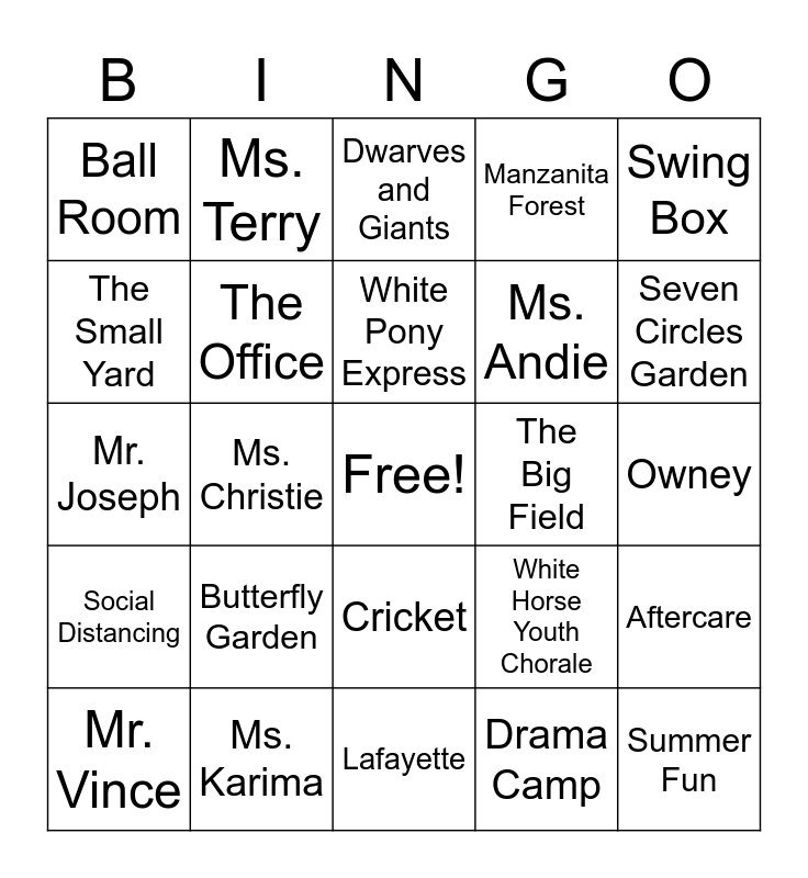 This bingo card has a free space and 24 words: Butterfly Garden, Ms. Karima, White Pony Express, Mr. Vince, Swing Box, Ball Room, The Small Yard, Ms. Terry, The Big Field, Cricket, Ms. Andie, Mr. Joseph, White Horse Youth Chorale, Aftercare, The Office, Drama Camp, Owney, Dwarves and Giants, Seven Circles Garden, Ms. Christie, Summer Fun, Social Distancing, Manzanita Forest and Lafayette.