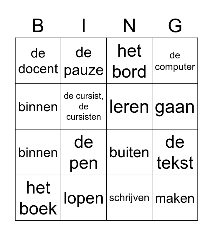 This bingo card has 25 words: Free!, de school, gaan, naar, binnen, de docent, de cursist, de cursisten, de pauze, lopen, samen, binnen, buiten, het getal, hoeveel, leren, luisteren, schrijven, het bord, de pen, de tekst, het boek, de opdracht, maken, de computer and spreken.