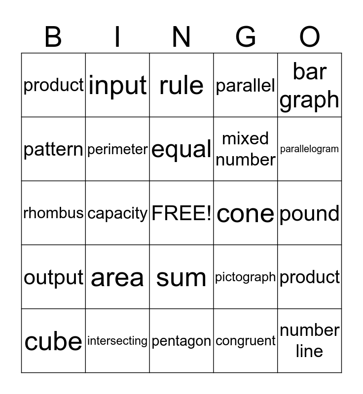 This bingo card has a free space and 28 words: product, estimate, mixed number, congruent, pattern, rule, input, output, cone, cube, rhombus, parallel, intersecting, pentagon, parallelogram, vertex, area, perimeter, equal, sum, product, difference, number line, capacity, pound, pictograph, bar graph and math.