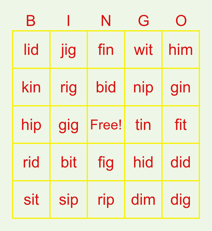This bingo card has a free space and 42 words: bin, bid, big, bit, dim, did, dig, dip, fin, fig, fit, gin, gig, him, his, hid, hit, hip, jib, jig, kin, kid, kit, lid, lit, lip, nip, pin, pig, pit, rim, rid, rig, rip, sin, sit, sip, tin, tip, win, wit and zip.