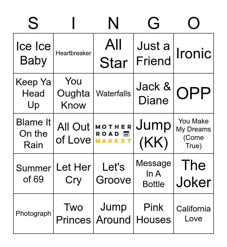 This bingo card has a free space and 142 words: A Horse With No Name, (Don't Fear) The Reaper, Just What I Needed, Bennie And The Jets, Slow Ride, Message In A Bottle, Killer Queen, You've Got A Friend, Me and Bobby McGee, It's Too Late, Long Cool Woman, Rocket Man, Band On The Run, Black Water, One of These Nights, Take It to the Limit, Bohemian Rhapsody, Dream On, Rich Girl, Dancing Queen, Dreams, The Joker, Another Brick in The Wall, Rock with You, Against The Wind, All Out of Love, Heartbreaker, Take The Long Way Home, Bette Davis Eyes, Jessie's Girl, Kiss on My List, Keep on Loving You, Urgent, You Make My Dreams (Come True), Don't Stand So Close To Me, The Stroke, Eye of the Tiger, Centerfold, Jack & Diane, Hurts So Good, Hard To Say I'm Sorry, 867-5309, Let's Groove, Heat of the Moment, Don't Stop Believin, Edge of Seventeen, Total Eclipse of the Heart, Africa, Little Red Corvette, 1999, Rock the Cashbah, Straight From The Heart, Photograph, Jump, All Night Long, Dancing In The Dark, I Guess That's Why The Call It The Blues, Sunglasses At Night, Caribbean Queen, Love Is A Battlefield, Thriller, Pink Houses, Careless Whisper, We Are The World, Saving All My Love for You, Summer of 69, Heaven, Hold On, Poison, Black Velvet, Step by Step, Ice Ice Baby, Blame It On the Rain, U Can't Touch This, Janie's Got a Gun, The Humpty Dance, Free Fallin, Make You Sweat, Just a Friend, More Than Words, Losing My Religion, Summertime, Where Does My Heart Beat, I Touch Myself, OPP, Baby Got Back, Jump (KK), Achy Breaky Heart, Jump Around, Smells Like Teen Spirit, I Can't Make You Love Me, I Will Always Love You, What's Up?, Two Princes, Dreamlover, All That She Wants, Bad Boys, Hey Jealousy, Bump n' Grind, Gin And Juice, Keep Ya Head Up, Mary Jane's Last Dance, Don't Take The Girl, Indian Outlaw, Waterfalls, Gangsta's Paradise, Kiss From a Rose, This Is How We Do It, One More Chance, Let Her Cry, Big Poppa, 1st of tha Month, Ironic, California Love, It's All Coming Back To Me Now, You Oughta Know, Breakfast at Tiffany's, No Diggity, Wonderwall, Pony, If It Makes You Happy, Can't Nobody Hold Me Down, Return of the Mack, How Do I Live, Wannabe, B*tch, Semi-Charmed Life, Mo Money Mo Problems, Tubthumping, Barbie Girl, Let Me Clear My Throat, Too Close, Nice & Slow, This Kiss, Cruel Summer, I'll Be, Believe, All Star, Angel, From This Moment On, Back At One and Write This Down.