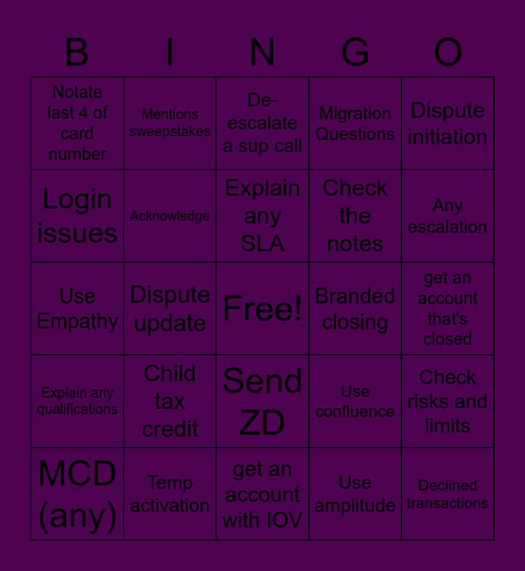This bingo card has a free space and 24 words: Child tax credit, Temp activation, Explain any SLA, MCD (any), Dispute initiation, Notate last 4 of card number, Login issues, Mentions sweepstakes, Branded closing, Send ZD, Check the notes, Use Empathy, Use confluence, Check risks and limits, Acknowledge, Use amplitude, get an account that's closed, De-escalate a sup call, Any escalation, Dispute update, Declined transactions, Explain any qualifications, Migration Questions and get an account with IOV.