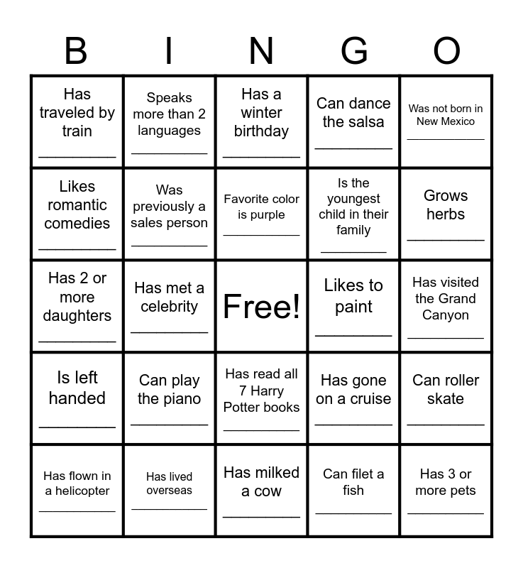 This bingo card has a free space and 24 words: Has flown in a helicopter ___________, Can play the piano _________, Favorite color is purple ___________, Can filet a fish __________, Was not born in New Mexico _____________, Has traveled by train _________, Speaks more than 2 languages __________, Has a winter birthday _________, Likes to paint ________, Has visited the Grand Canyon __________, Has 2 or more daughters _________, Was previously a sales person __________, Has gone on a cruise _________, Can roller skate _________, Likes romantic comedies _________, Has lived overseas ____________, Has milked a cow _________, Can dance the salsa _________, Grows herbs _________, Is left handed ________, Has met a celebrity _________, Has read all 7 Harry Potter books __________, Is the youngest child in their family _________ and Has 3 or more pets __________.