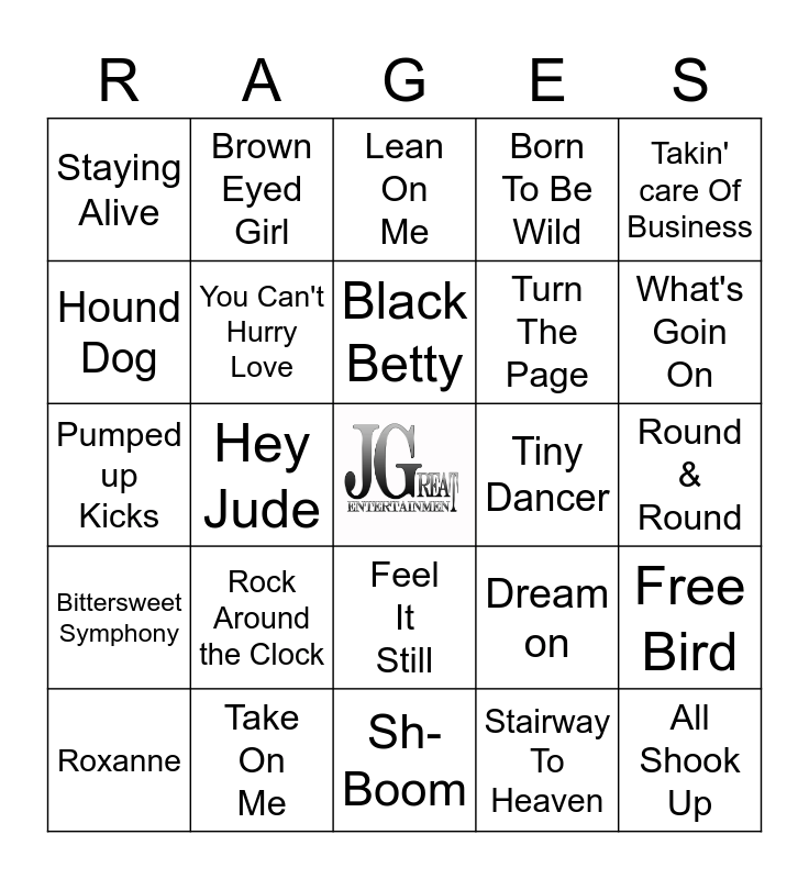 This bingo card has a free space and 51 words: Tutti Fruity, All Shook Up, Splish Splash, Sh-Boom, Rock Around the Clock, You Really Got Me, Brown Eyed Girl, Somebody To Love, Hound Dog, Wouldn't It Be Nice, You Can't Hurry Love, Born To Be Wild, Free Bird, Dream on, Old Time Rock & Roll, Bennie And The Jets, Black Betty, Tiny Dancer, Beast Of Burden, Takin' care Of Business, Hey Jude, Stairway To Heaven, Staying Alive, Turn The Page, Play That Funky Music, Dancing Queen, What's Goin On, Let's get It On, Roxanne, Lean On Me, Don't Stop Til You Get Enough, Love Train, With or Without You, Start Me Up, Total Eclipse of the Heart, Take On Me, Hit Me With Your Best Shot, Fight For Your Right, Rebel Yell, The Boys Of Summer, Round & Round, Bittersweet Symphony, Heart-Shaped Box, Thunderstruck, Last Resort, Hey Ya, Pumped up Kicks, Uptown Funk, We Are Young, Feel It Still and Ain't It Fun.