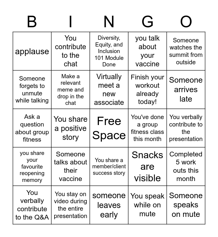 This bingo card has a free space and 24 words: Someone talks about their vaccine, You stay on video during the entire presentation, Virtually meet a new associate, You verbally contribute to the Q&A, Someone watches the summit from outside, applause, Someone forgets to unmute while talking, You contribute to the chat, You've done a group fitness class this month, You share a member/client success story, Finish your workout already today!, Ask a question about group fitness, Snacks are visible, Completed 5 work outs this month, Make a relevant meme and drop in the chat, You speak while on mute, You verbally contribute to the presentation, Diversity, Equity, and Inclusion 101 Module Done, Someone arrives late, You share a positive story, Someone speaks on mute, you share your favourite reopening memory, you talk about your vaccine and someone leaves early.