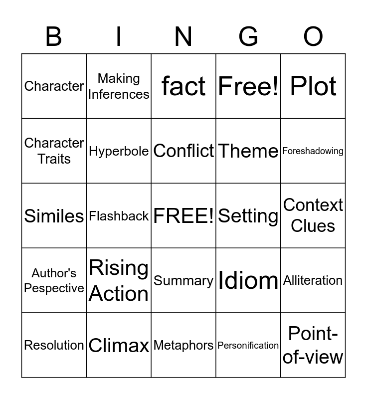 This bingo card has a free space and 24 words: Rising Action, Climax, Conflict, Resolution, Plot, Character, Character Traits, Making Inferences, Setting, Summary, Theme, Similes, Idiom, Alliteration, Hyperbole, Personification, Context Clues, fact, Foreshadowing, Flashback, Point-of-view, Author's Pespective, Free! and Metaphors.