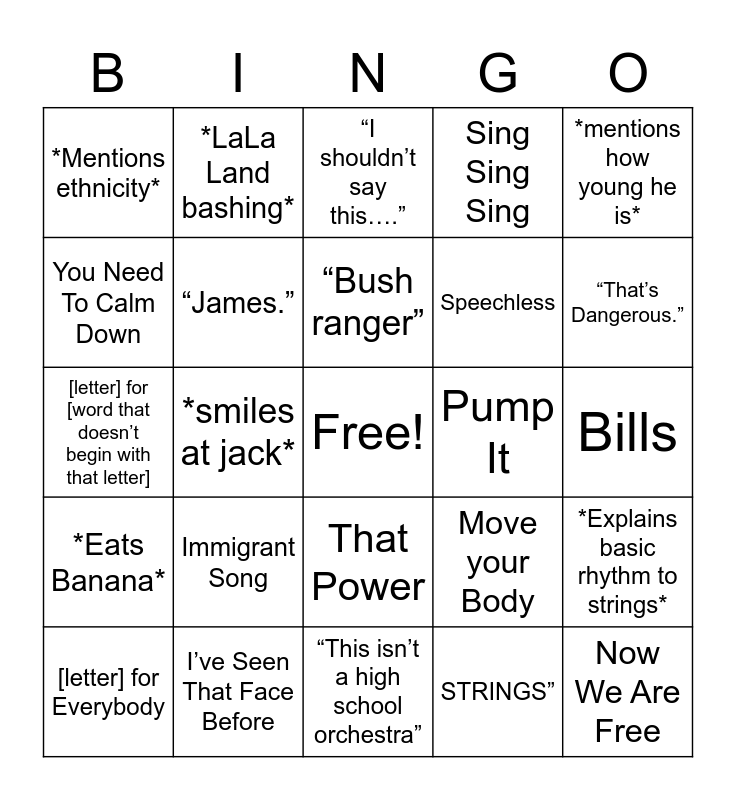 This bingo card has a free space and 32 words: STRINGS”, *compliments grace*, *smiles at jack*, *tells irrelevant story*, *Eats Banana*, “James.”, *mentions how young he is*, *Explains basic rhythm to strings*, *LaLa Land bashing*, “It doesn’t count as string bashing”, “Bush ranger”, “I shouldn’t say this….”, “I might get fired”, So Real, Pump It, “You need to smile while playing this”, [letter] for Everybody, [letter] for [word that doesn’t begin with that letter], That Power, Immigrant Song, Move your Body, *dances*, Bills, I’ve Seen That Face Before, Now We Are Free, Sing Sing Sing, Speechless, You Need To Calm Down, *Mentions ethnicity*, “This isn’t a high school orchestra”, *Stops after first bar of a song* and “That’s Dangerous.”.