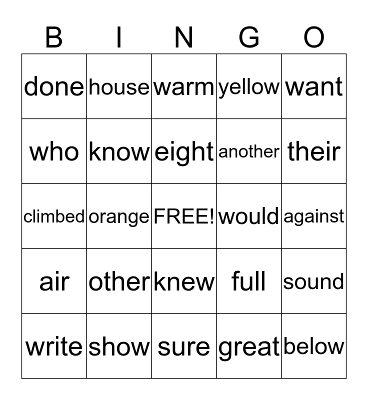 This bingo card has a free space and 24 words: other, show, eight, write, want, done, who, house, would, knew, another, climbed, full, sound, know, great, against, warm, their, orange, below, air, yellow and sure.