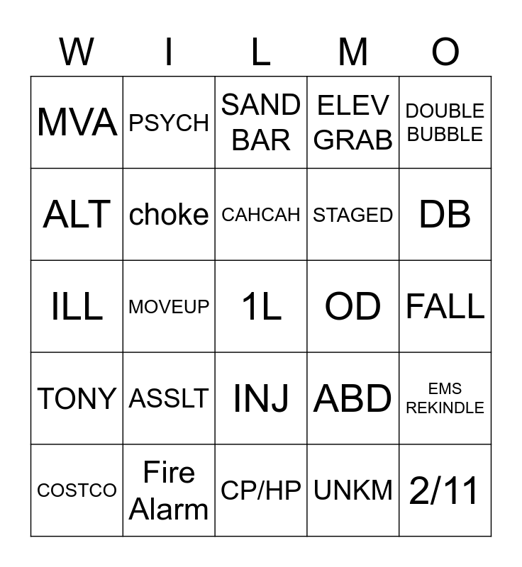 This bingo card has a free space and 26 words: INJ, UNKM, CAHCAH, Fire Alarm, DOUBLE BUBBLE, MVA, ALT, PSYCH, FALL, ABD, STAGED, ILL, EMS REKINDLE, COSTCO, MOVEUP, VA, ELEV GRAB, TONY, SAND BAR, 2/11, DB, CP/HP, OD, ASSLT, choke and BILL Squire.