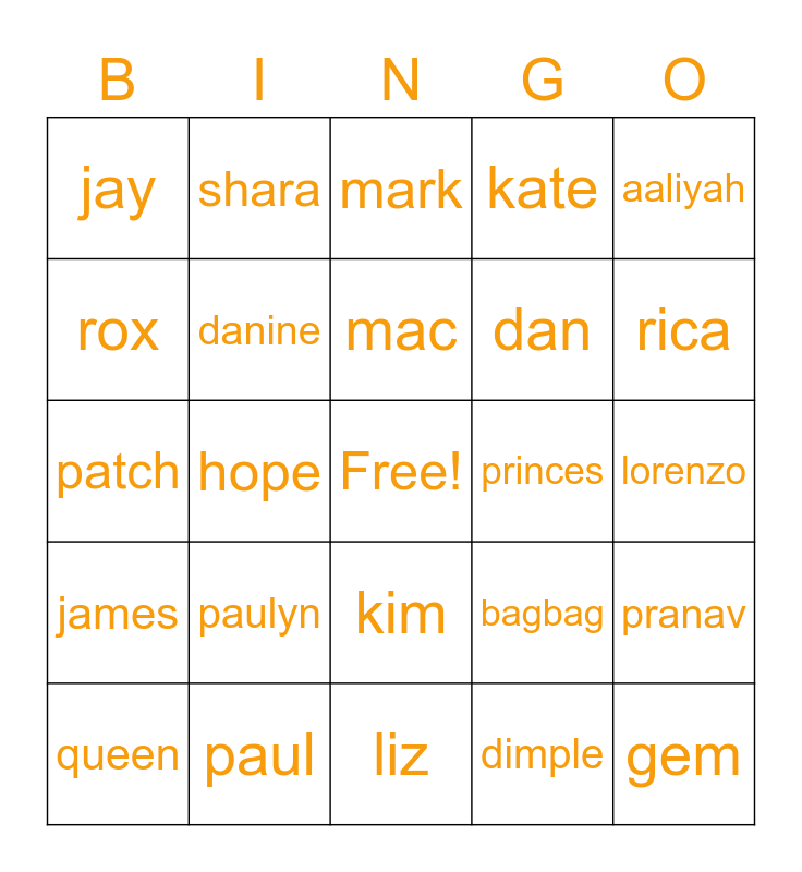 This bingo card has a free space and 24 words: paulyn, paul, mac, queen, aaliyah, jay, rox, shara, princes, kim, dan, patch, bagbag, pranav, danine, dimple, lorenzo, mark, rica, hope, gem, james, kate and liz.