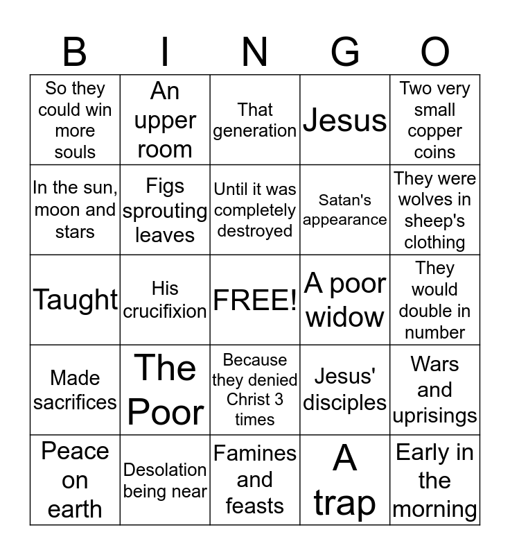 This bingo card has a free space and 24 words: The Poor, Desolation being near, Until it was completely destroyed, Peace on earth, Two very small copper coins, So they could win more souls, In the sun, moon and stars, An upper room, A poor widow, Because they denied Christ 3 times, Satan's appearance, Taught, Jesus' disciples, Wars and uprisings, Figs sprouting leaves, A trap, They would double in number, That generation, They were wolves in sheep's clothing, His crucifixion, Early in the morning, Made sacrifices, Jesus and Famines and feasts.