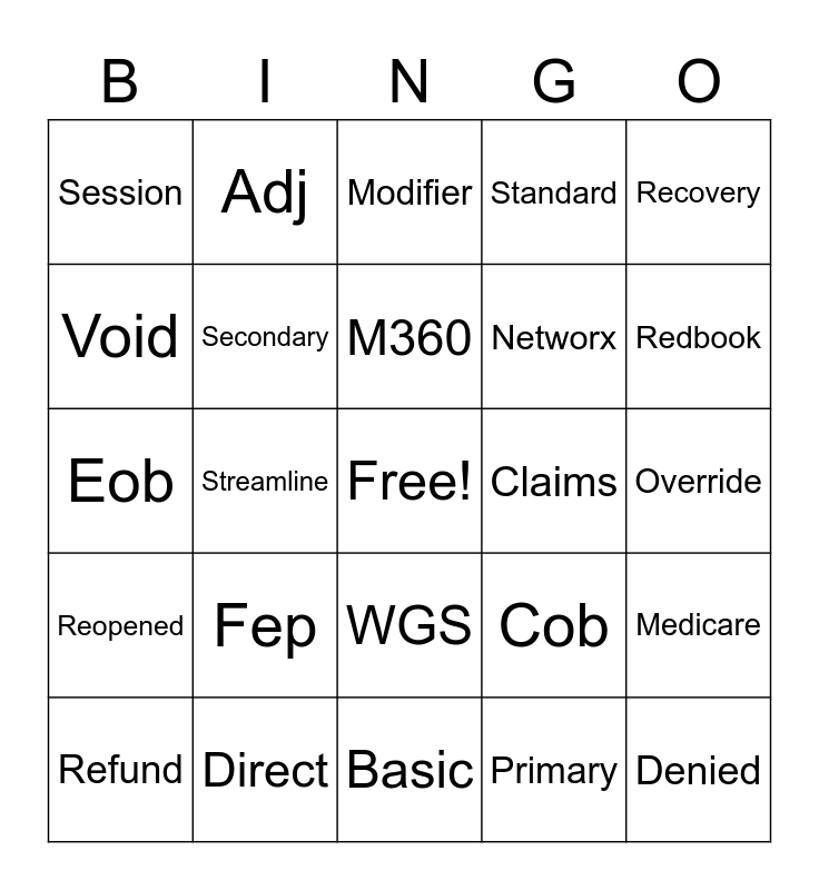 This bingo card has a free space and 24 words: Fep, Direct, M360, Refund, Recovery, Session, Void, Adj, Claims, WGS, Networx, Eob, Cob, Medicare, Secondary, Primary, Override, Modifier, Redbook, Streamline, Denied, Reopened, Standard and Basic.
