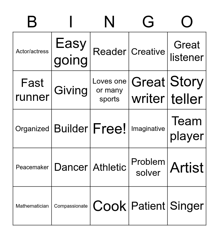 This bingo card has a free space and 24 words: Dancer, Compassionate, Loves one or many sports, Mathematician, Great listener, Actor/actress, Fast runner, Easy going, Imaginative, Athletic, Great writer, Organized, Problem solver, Artist, Giving, Patient, Team player, Reader, Story teller, Builder, Singer, Peacemaker, Creative and Cook.