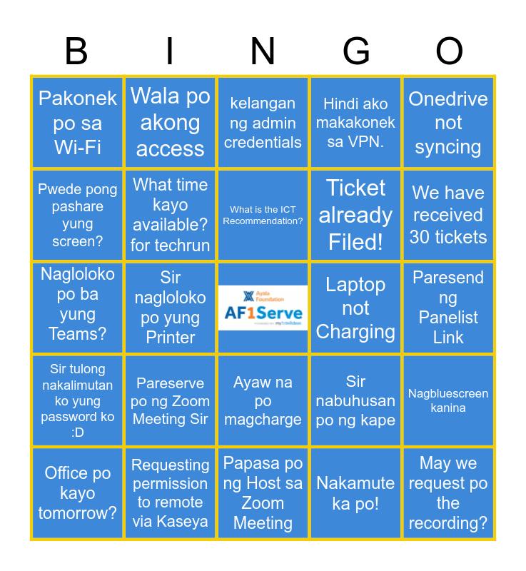 This bingo card has a free space and 24 words: Pareserve po ng Zoom Meeting Sir, Requesting permission to remote via Kaseya, What is the ICT Recommendation?, Office po kayo tomorrow?, Onedrive not syncing, Pakonek po sa Wi-Fi, Pwede pong pashare yung screen?, Wala po akong access, Laptop not Charging, Ayaw na po magcharge, Ticket already Filed!, Nagloloko po ba yung Teams?, Sir nabuhusan po ng kape, Nagbluescreen kanina, What time kayo available? for techrun, Nakamute ka po!, Paresend ng Panelist Link, kelangan ng admin credentials, We have received 30 tickets, Sir nagloloko po yung Printer, May we request po the recording?, Sir tulong nakalimutan ko yung password ko :D, Hindi ako makakonek sa VPN. and Papasa po ng Host sa Zoom Meeting.