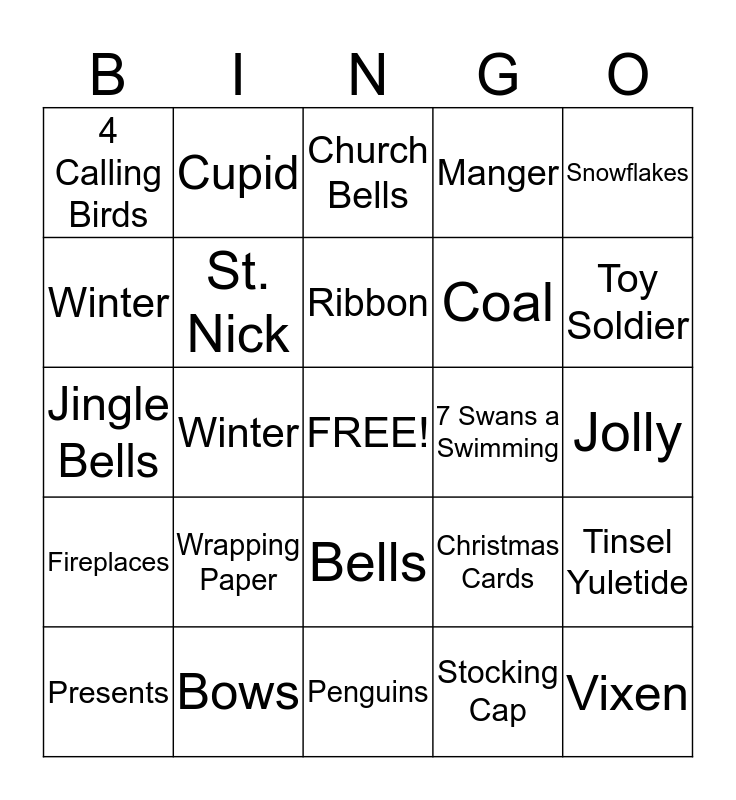 This bingo card has a free space and 24 words: Wrapping Paper, Bows, Ribbon, Presents, Snowflakes, 4 Calling Birds, Winter, Cupid, 7 Swans a Swimming, Bells, Coal, Jingle Bells, Christmas Cards, Tinsel Yuletide, St. Nick, Stocking Cap, Jolly, Church Bells, Toy Soldier, Winter, Vixen, Fireplaces, Manger and Penguins.