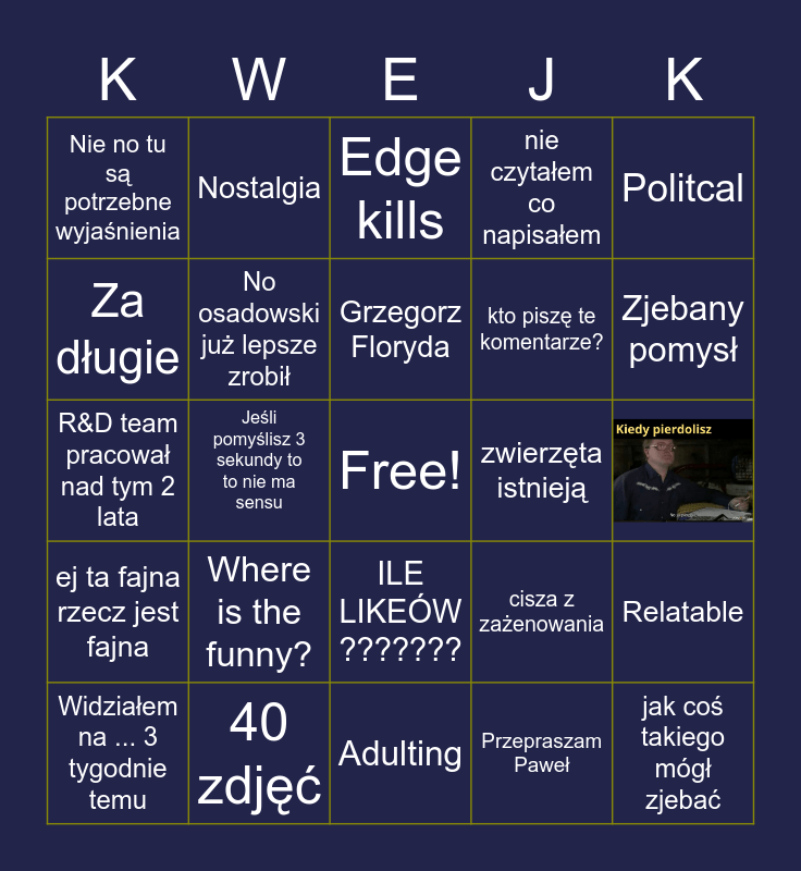 This bingo card has 1 images, a free space and 23 words: Where is the funny?, 40 zdjęć, Grzegorz Floryda, Widziałem na ... 3 tygodnie temu, Politcal, Nie no tu są potrzebne wyjaśnienia, Za długie, Nostalgia, zwierzęta istnieją, ILE LIKEÓW ???????, kto piszę te komentarze?, R&D team pracował nad tym 2 lata, cisza z zażenowania, Relatable, No osadowski już lepsze zrobił, Przepraszam Paweł, Edge kills, Zjebany pomysł, Jeśli pomyślisz 3 sekundy to to nie ma sensu, jak coś takiego mógł zjebać, ej ta fajna rzecz jest fajna, nie czytałem co napisałem and Adulting.