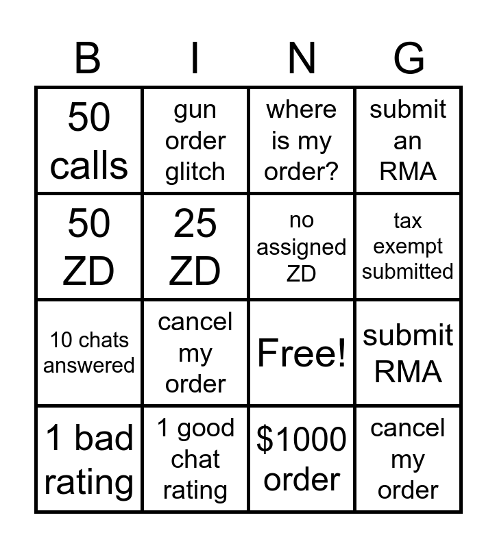 This bingo card has 22 words: 1 good chat rating, 50 ZD, gun order glitch, clean your desk, 25 ZD, no assigned ZD, 50 calls, where is my order?, Free!, cancel my order, 10 chats answered, submit an RMA, 1 bad rating, 5 good chat ratings, $1000 order, 35 calls, submit RMA, 1 bad rating, cancel my order, 50 ZD, tax exempt submitted and 10 chats answered.